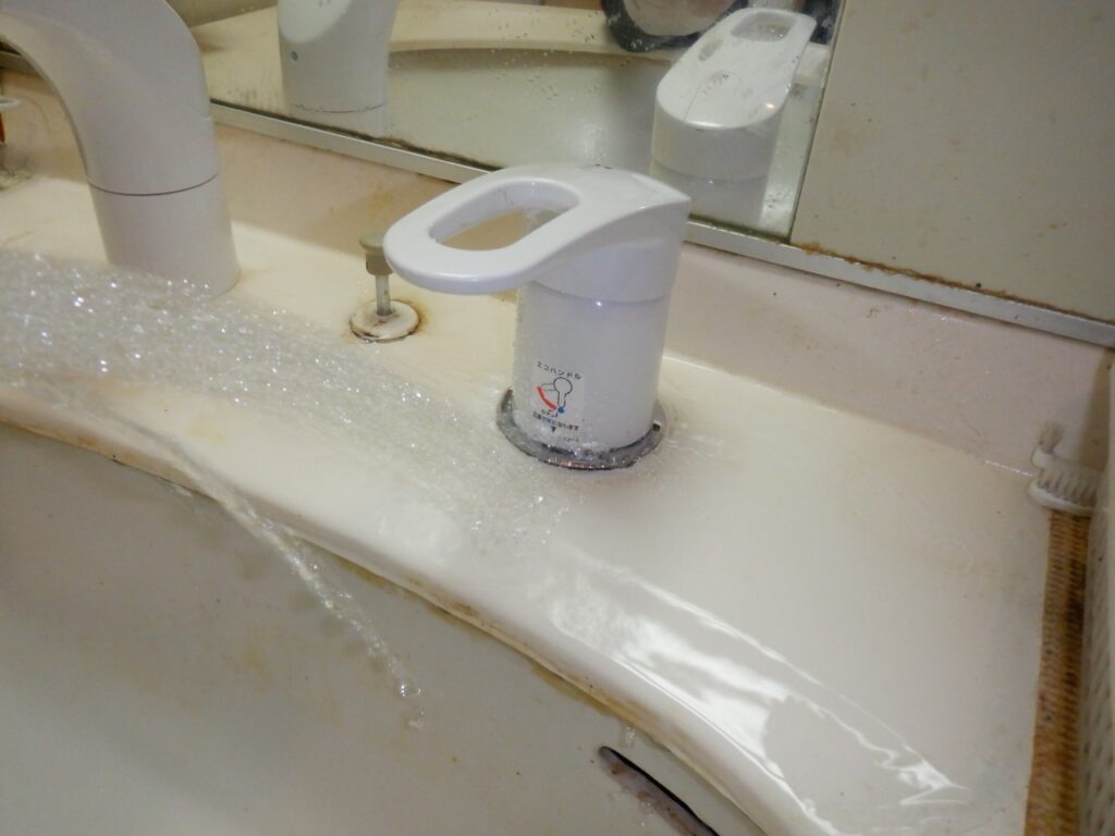 ・洗面台下の収納内が水びたしになっている。洗面台の下から水が出てくる。