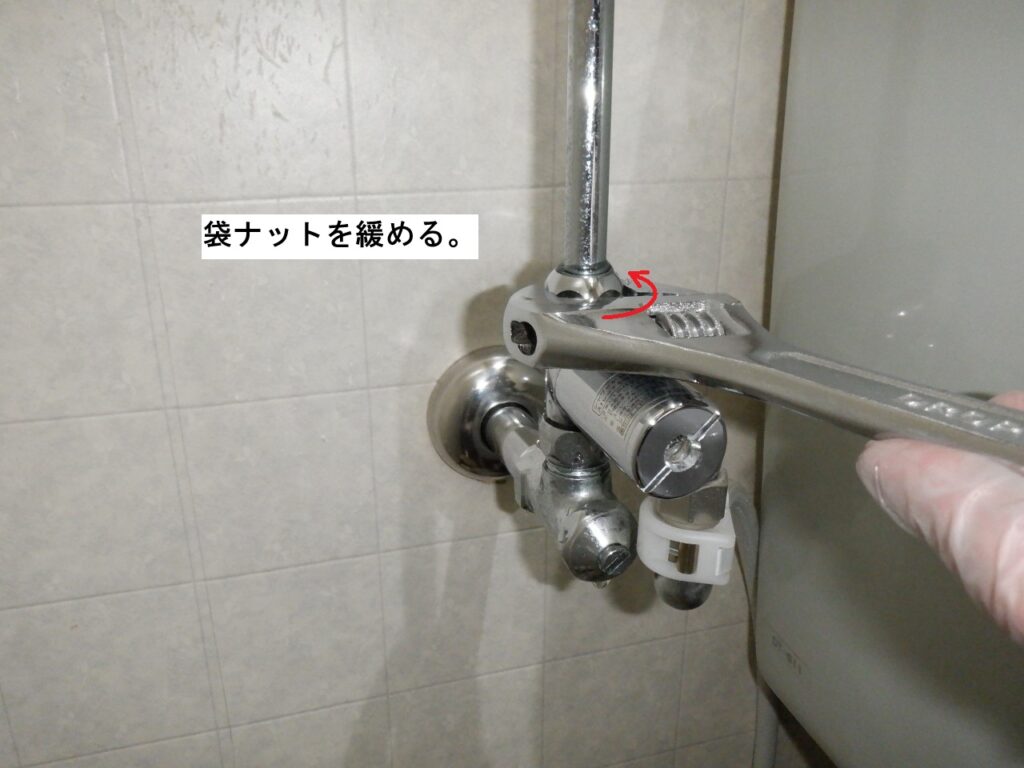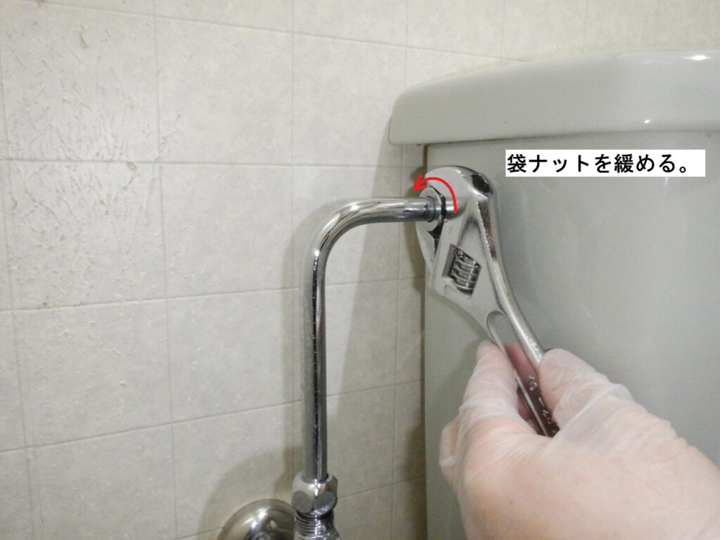 ロータンク側の袋ナットを工具を使って緩めます。