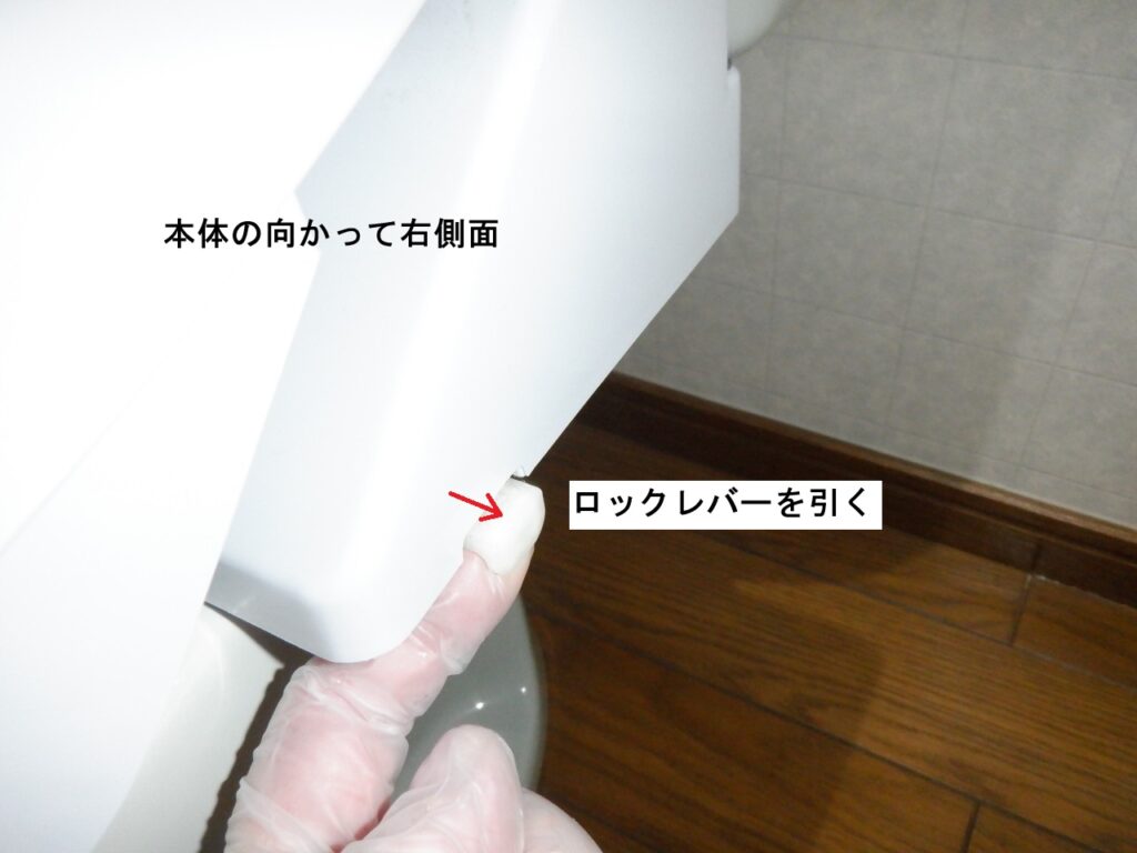レバーを引いた状態で、シャワートイレ本体を手前にスライドして取り外します。