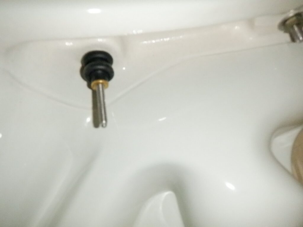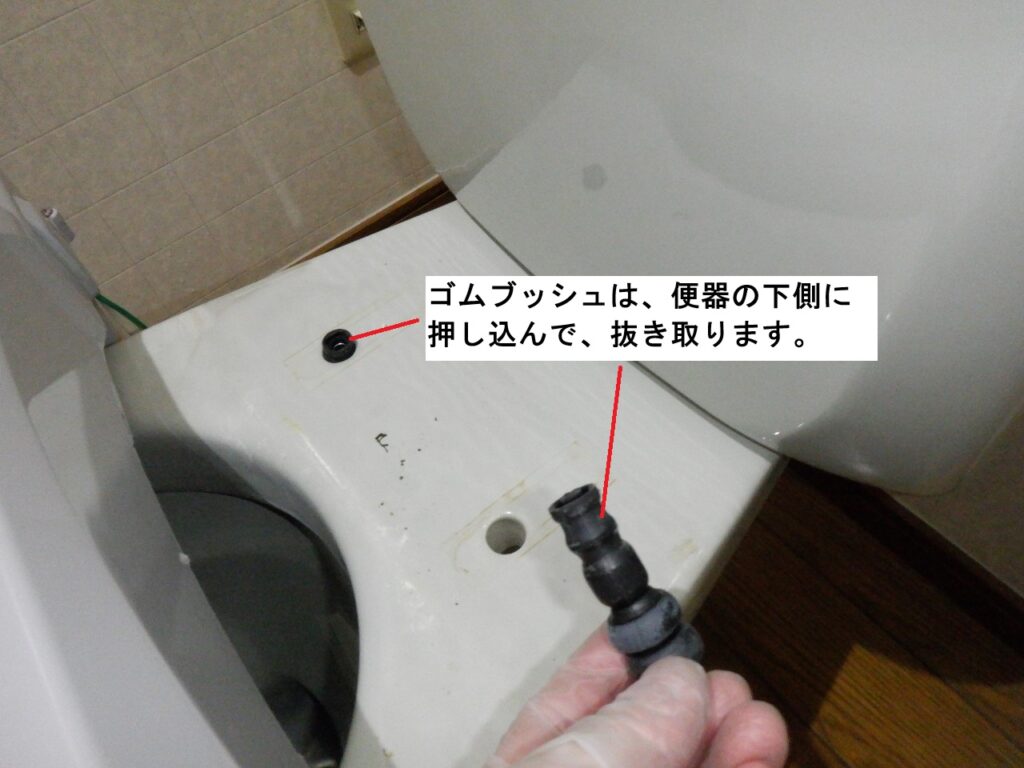 便器の取付穴に残ったゴムブッシュを下側から抜き取ります。