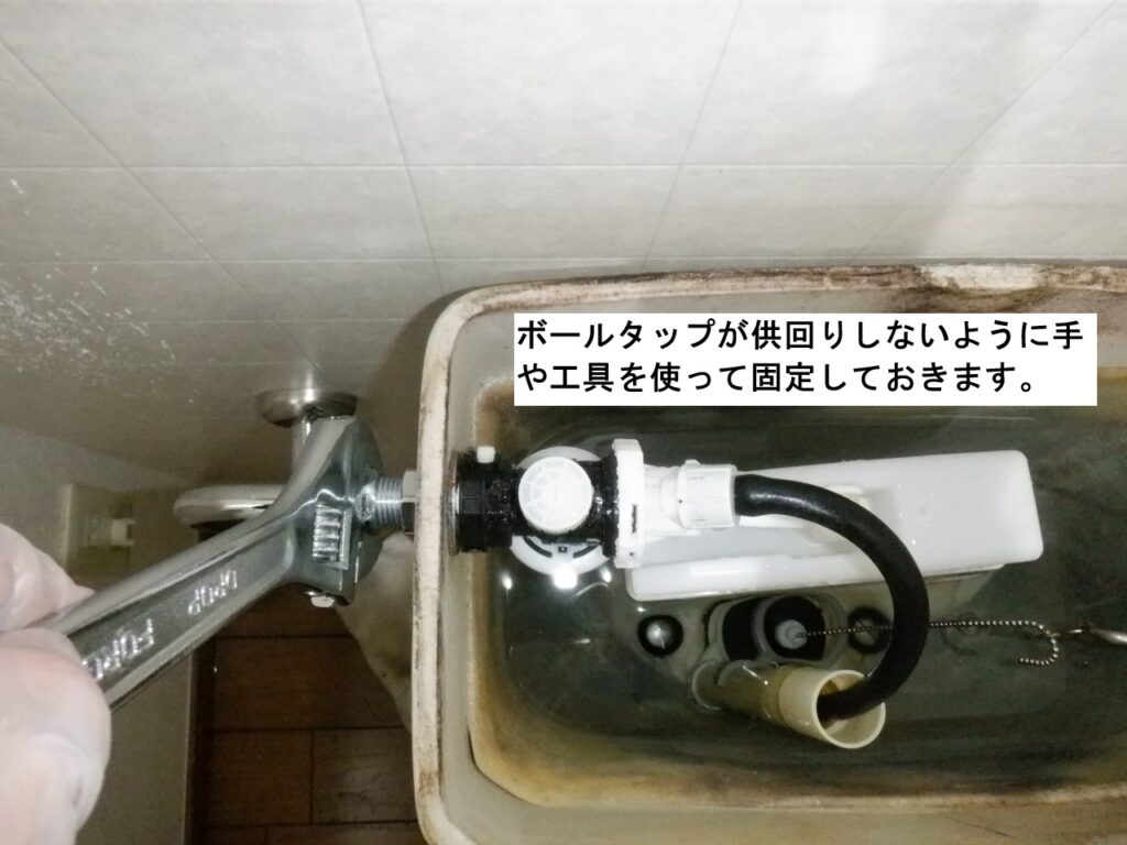 タンク側のナットを閉める際に、ボールタップが供回りしてしまわないように注意しましょう。