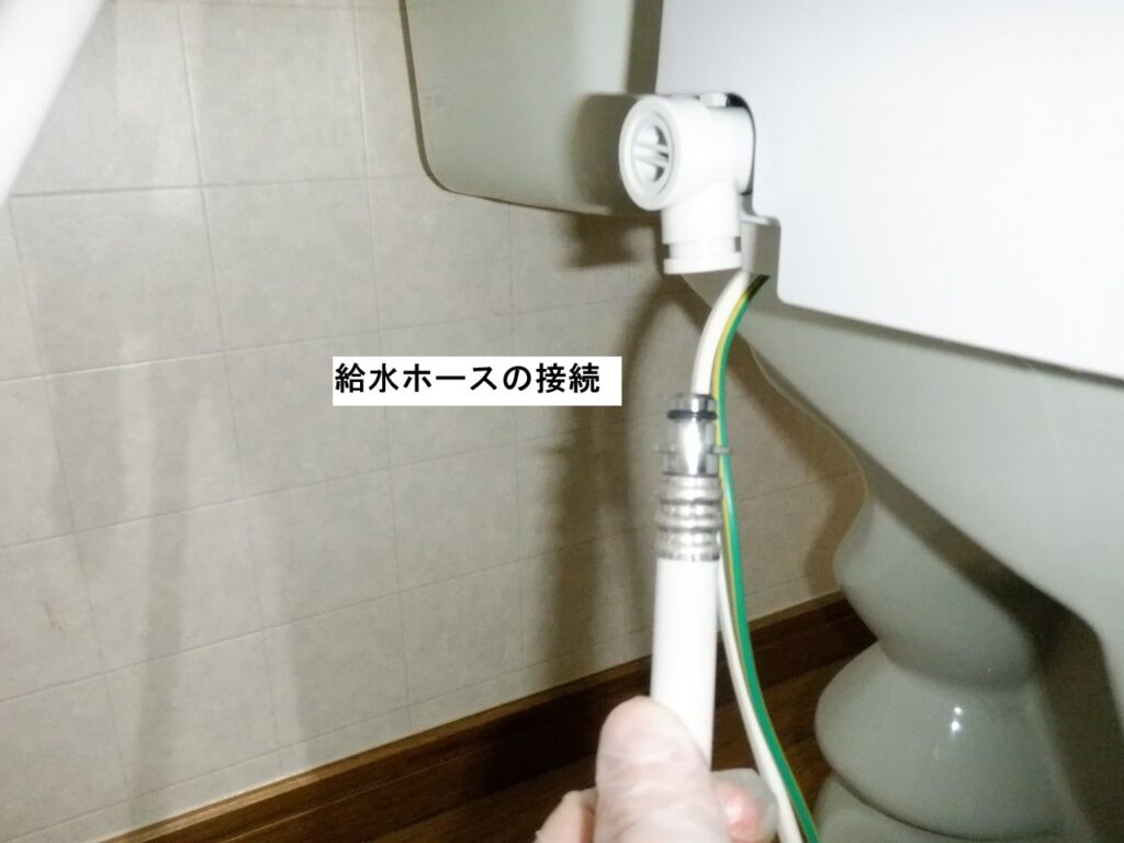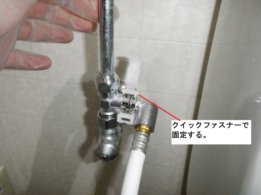 シャワートイレ本体に、給水ホースを接続。クイックファスナーで固定します。