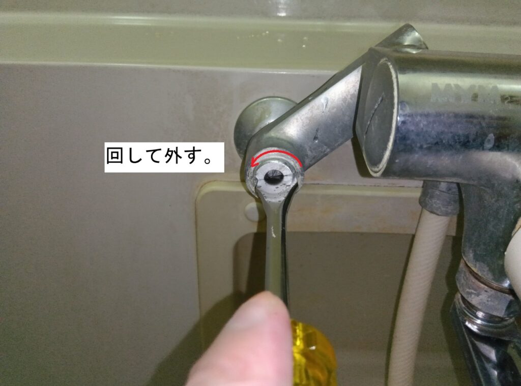 続いて内部のネジをプラスドライバーで回し、ハンドルを真横に抜き取ります。