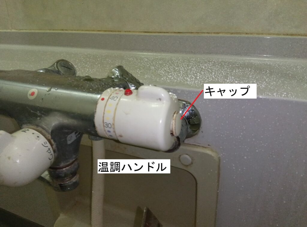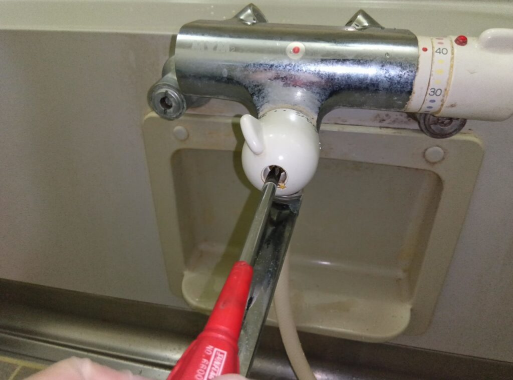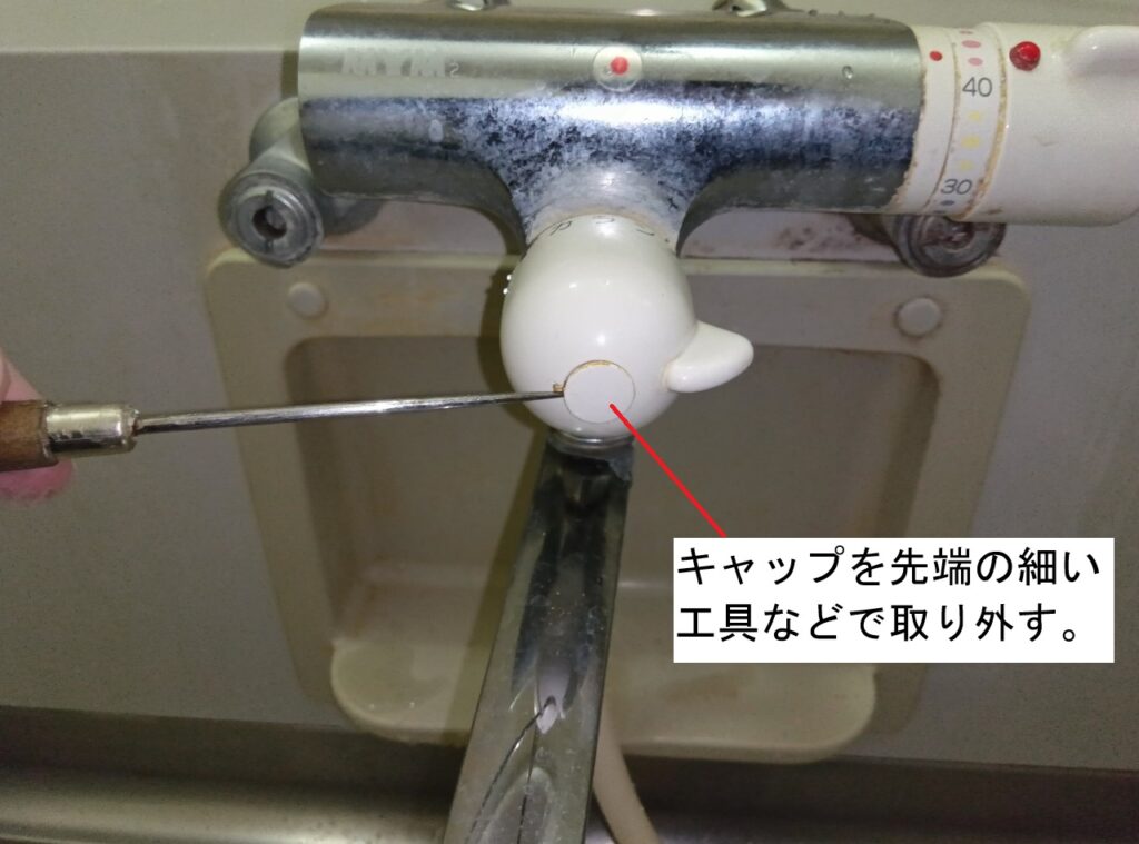 温調ハンドルの側面についている丸いキャップを、先端の細い工具を使い取り外します。
