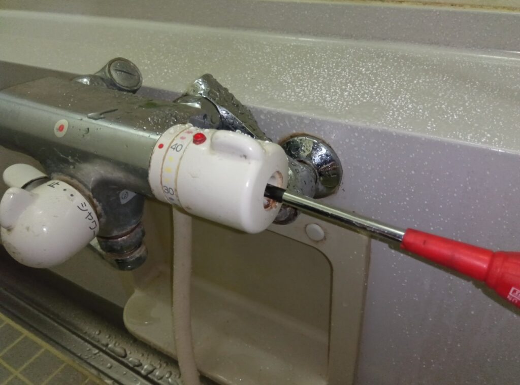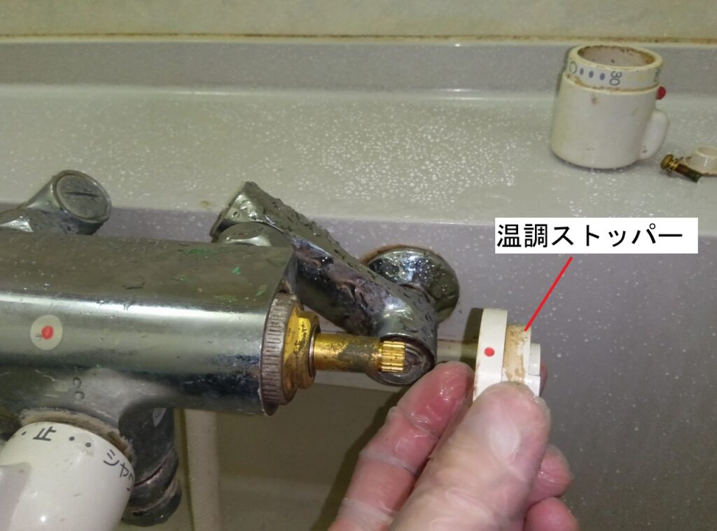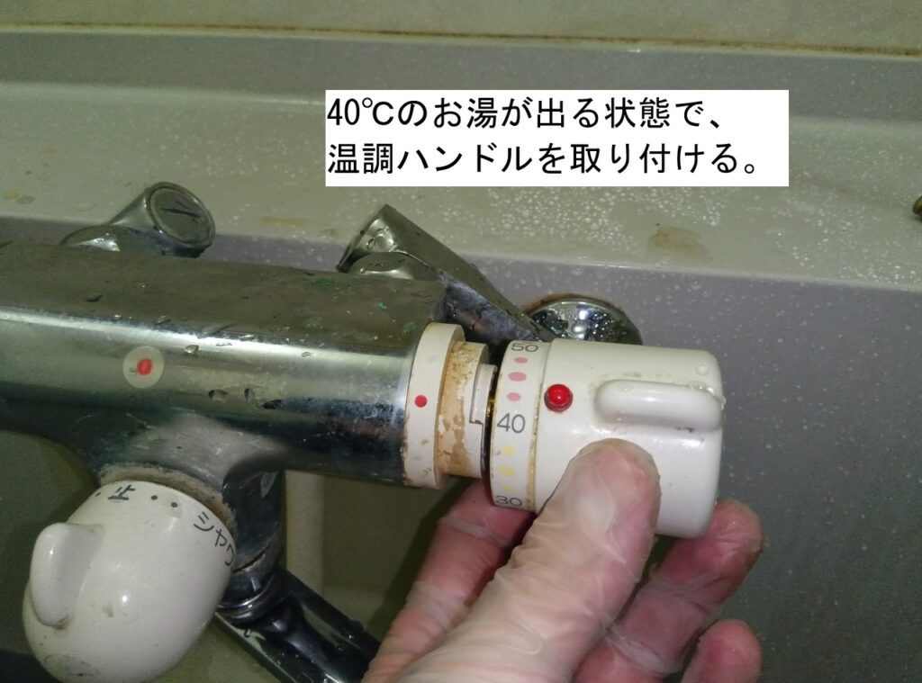 温調ハンドルは取り付ける前に、水栓から40℃のお湯が出る位置に温調カートリッジの芯棒を合わせ、その位置でハンドルを取り付けます。