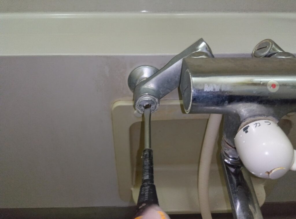 水栓の取付脚の止水栓をマイナスドライバーで閉め、水・湯を止めます。