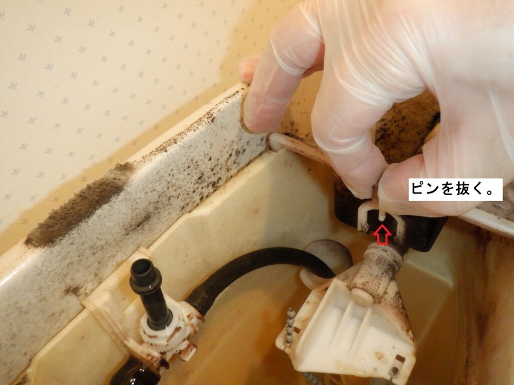 続いて、ボールタップ本体部のホルダー(ツメ)2箇所を外側に広げ、ボールタップを真上に引き抜きます。