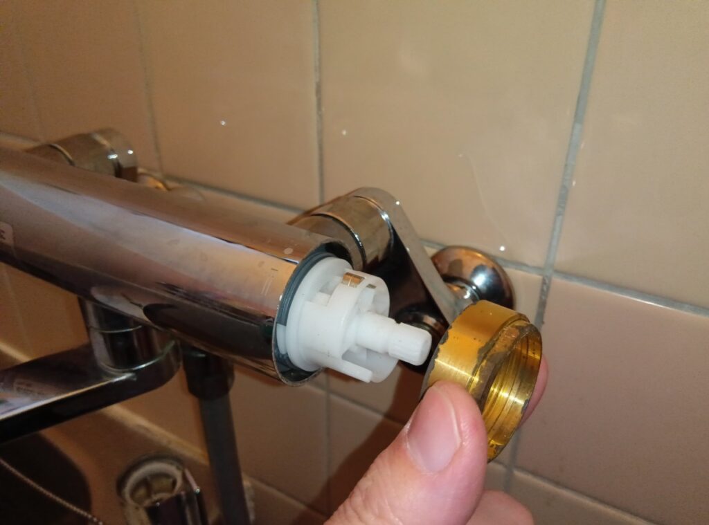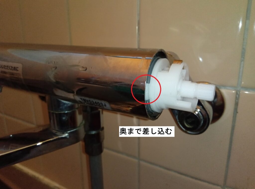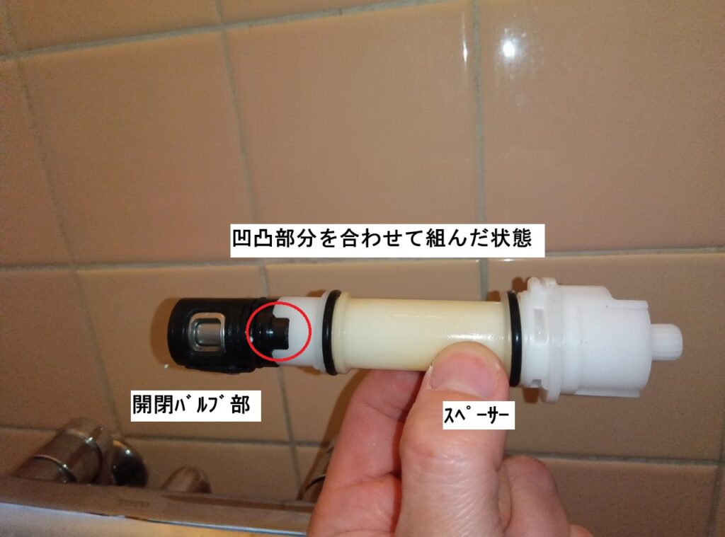 新しい開閉バルブ部と、スペーサーを凹凸部分をかみ合わせて、水栓本体に差し込みます。