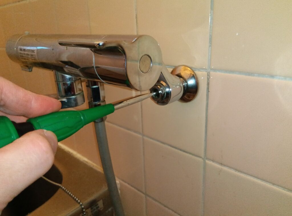 取付脚の止水栓マイナスドライバーで閉め、水(湯)を止水します。