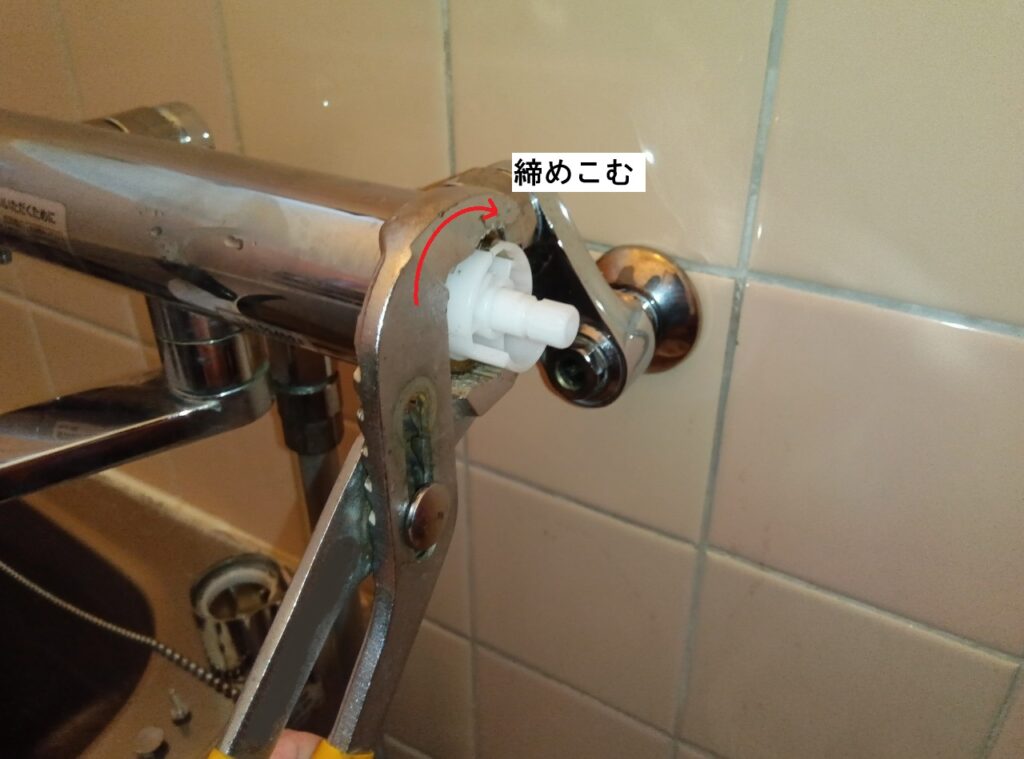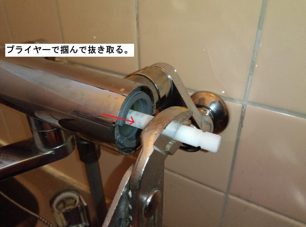 開閉バルブ部の軸部分プライヤーで掴み、真横に強く引っ張って抜き取ります。